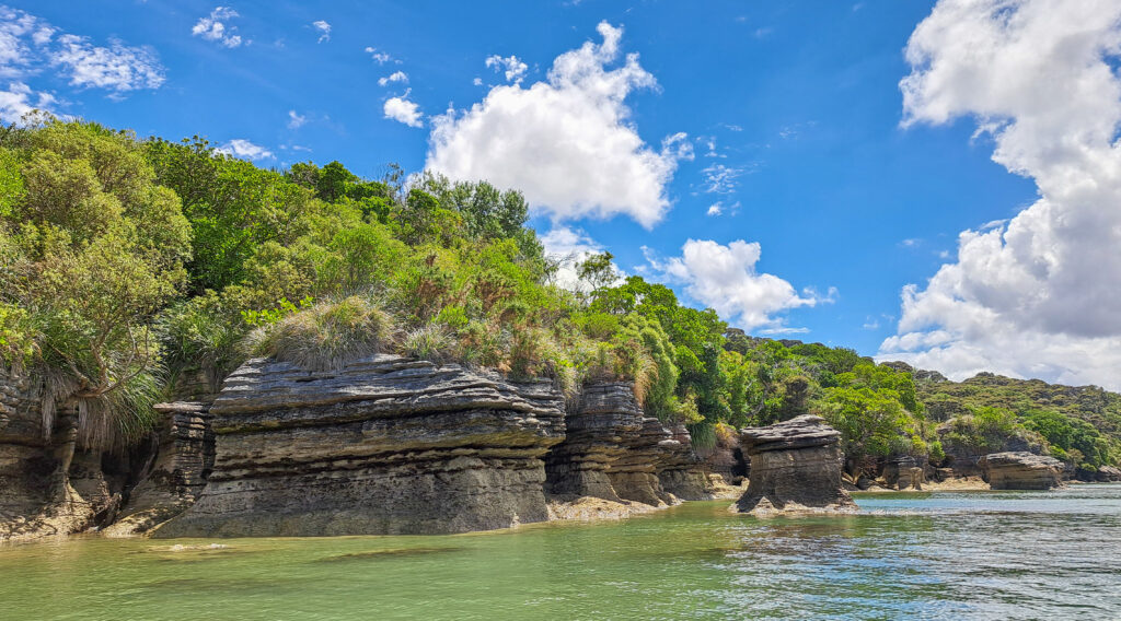 Raglan ist ein kleiner Ort mit einem Traumhaften Strand, einer Art Fjord und als Surfer-Mekka bekannt. Statt einem Brett leihe ich mir doch ein Kajak, denn ich wollte die Limestones – schöne Felsformationen auf der anderen Seite des Fjords ansehen. Da ich aus versicherungsrechtlichen Gründen alleine jedoch kein Kajak mieten darf, muss ich mich einer geführten Tour anschließen. Als wir in die Boote steigen wollen, prasselt ein Regenschauer auf unser herab und die Familie, die mit mir noch die Tour gebucht hatte, sprang ab. So war ich plötzlich mit der Guidin alleine. 10 Min später hörte auch der Regen auf und wir paddelten bei strahlendem Sonnenschein auf die andere Seite zu den Felsen.