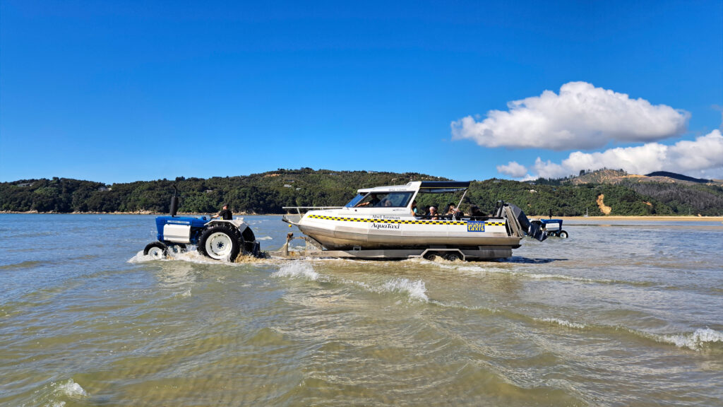 Das Warten hat sich auf jeden Fall gelohntAm nächsten Tag schien die Sonne vom wolkenlos blauen Himmel. Auch die Zikaden zirpten wieder – so laut, dass es sogar bei geschlossenem Fenster, Motorlärm und Musik zu hören war. Zunächst ging es in Marahau auf ein Wassertaxi. Die Boote standen auf Trailern an Land und viele Menschen warteten auf das richtige Boot, das sie zum Ausgangspunkt der Wanderung auf dem Abel Tasman Costal Track brachte. Der zählt zu den schönsten Wanderwegen Neuseelands und ist bei jeder Neuseelandreise ein Muss. Dementsprechend ging es hier etwas touristischer zu.