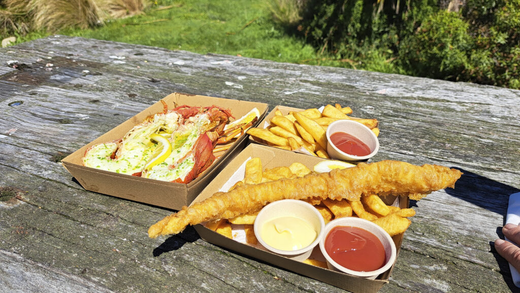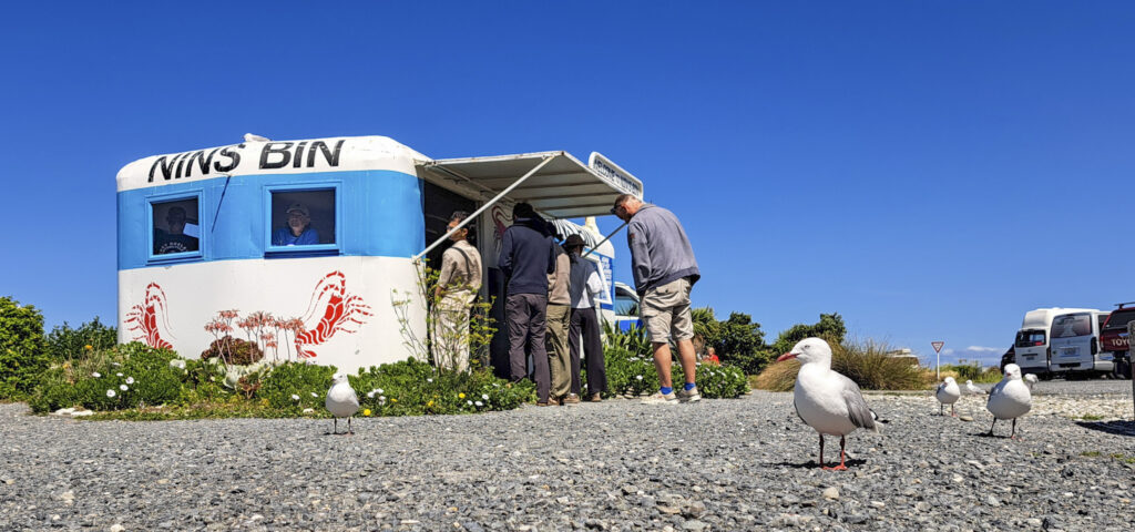 Weiter ging es auf der Pacific Road auf dem schmalen Stück Land zwischen Meer und Bergen weiter nach Norden. Die Straße für sich war schon sehenswert. Es gab permanenten Meerblick auf türkisblaues Wasser und Karibik-feeling. Wir stoppten am legendären Straßenimbiss Nin´s Bin und gönnten uns ein Luxusessen: Crayfish (eine Art Hummer) mit Knoblauchbutter und Fish & Chips. Die Möwen warteten gierig vor dem Imbisswagen und ich wartete darauf, dass sie sich auf die ahnungslösen Touristen stürzten um ihnen das Essen aus der Hand zu reißen. So kannte ich es schließlich von zuhause. Draußen Fischbrötchen essen ist in Kiel kaum noch ohne Möwenangriff möglich. Doch in Neuseeland geschah nichts dergleichen. Die Möwen saßen einfach nur da und sahen den Menschen beim Essen zu.