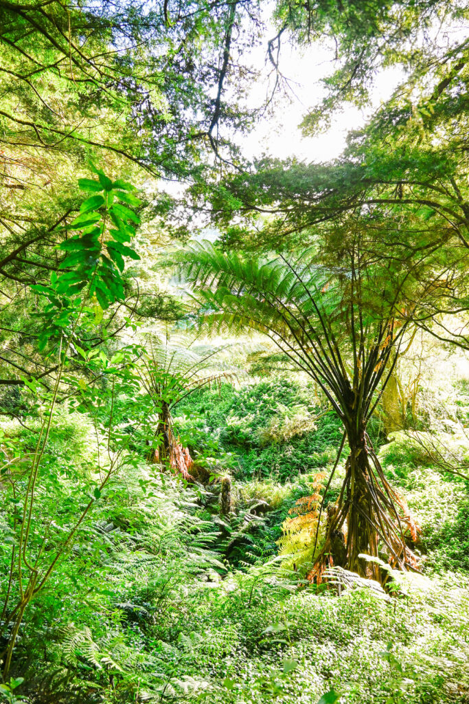 Mein erster Stopp sind die Waipu Caves. Eine Höhle in einer Bilderbuch-Hügel-Landschaft. Die Höhle ist unspektakulär. Dafür ist der Wald, der sie umgibt, umso schöner. Ein richtiger Urwald mit mehreren Vegetationsebenen. Bis zum Knie reichen kleinere Farne und Moose. Größere Farnpalmen, Palmen und Drachenbäume bilden mit ca. 5m Wuchshöhe die mittlere Schicht und Bäume bilden mit 20 und mehr Metern das Dach des Urwaldes. Überall singt, zwitschert und summt es. Es gibt Pflanzen, die auf Pflanzen wachsen und ich gehe fasziniert ein bisschen den Trampelpfad in den Urwald hinein.