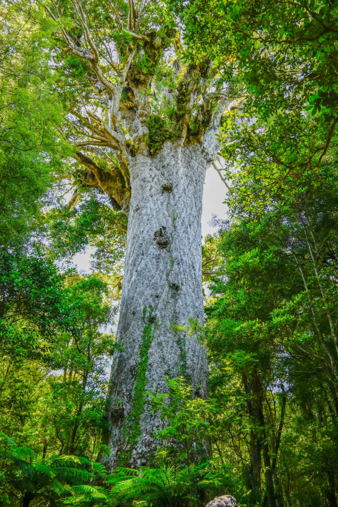 Besonders beeindruckend waren die uralten Kauribäume etwas weiter südlich im Waipoua Forest. Es sind die ältesten des Landes. Tane Mahuta (Vater des Waldes) ist mit mehr als 50m Höhe der größte Baum Neuseelands. Sein Stamm ist mit 4,5m Durchmessern unfassbar dick. Eigentlich sieht man nur Stamm. Die Krone verschwindet irgendwo im Dickicht der anderen Bäume, die daneben aber winzig aussehen. Etwas weiter der ebenso dicke, aber aufgrund eines Sturmschadens weniger Hohe Te Matua Ngahere und mit 3000 – 4000 Jahren der älteste Baum Neuseelands. Was er wohl alles erlebt hat, in seinem Baumleben?