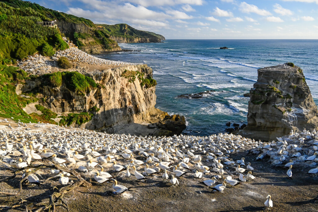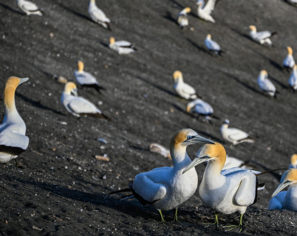 Nach ca. 9 Tagen erreiche ich wieder den Speckgürtel von Auckland. In Muriwai Beach beobachtete ich tausende Basstölpel bei der Aufzucht ihres Nachwuchses. Dass diese Vögel sich auf so engem Raum (ca. 2-3 Nester pro m²) wohlfühlen, wo es doch unendlich viel Platz gibt, ist mir ein Rätsel. Die weißen Vögel mit ihren gelben Köpfen und blauen Augen bleiben ein Leben lang zusammen und ziehen jedes Jahr ein Junges groß. Sie bleiben abwechselnd beim Nachwuchs, während der andere auf Nahrungssuche geht. Wenn der Ausflügler wieder kommt, gibt es erstmal eine lautstarke Begrüßung, bei der die Schnäbel aneinander gerieben werden. Dann wird sich gegenseitig erstmal ausgiebig geputzt.