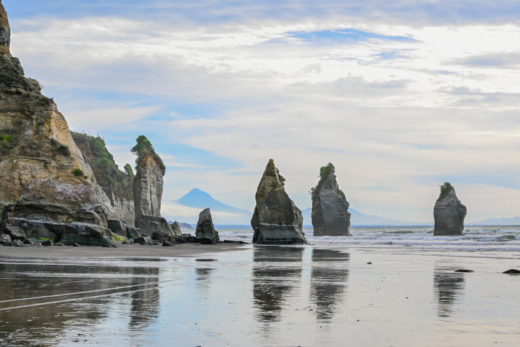 Nach ca. 30 Km Schotterpiste durch eine Bilderbuch-Hügellandschaft und endlosen Weiden, auf denen Schafe und Rinder grasten und ein glückliches Leben genossen, kam ich bei den Three Sisters an. Drei Fels-Säulen vor einer Steilküste, die nur bei Ebbe zu erreichen waren. Leider stimmte der neuseeländische Tidenkalender nicht, den ich mir extra herausgesucht habe. Als ich dies bemerkte, war es fast schon zu spät, aber ich schaffte es gerade noch rechtzeitig zu den Felsformationen, die tatsächlich aussahen, wie drei Nonnen im Wasser. Daher wohl auch der Name „The Three Sisters“.