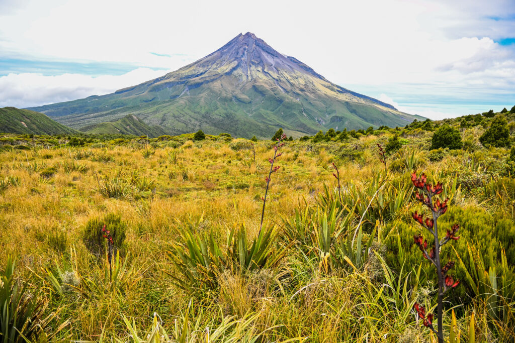 Die nächste Wanderung wäre eigentlich nur wenige Autominuten entfernt gewesen, wäre da nicht eine Straßensperrung, die mich zu 200 km Umweg zwang. Das bedeutete 5 Std. Fahrt über den legendären Forgotten World Highway. Eine schmale Straße, teilweise nur einspurig, die sich zwischen den steilen Hügeln entlang wand. Teilweise mit spektakulären Aussichten auf die beiden Vulkane Mount Taranaki und Tongariro. Auf dieser Straße war ungewöhnlich viel Verkehr, was die Fahrt zu einer echten Herausforderung machte, da nicht überall zwei Autos locker nebeneinander passten. Ich war froh, dass Sonntag war und keine großen LKWs unterwegs waren. Die Straßenabbrüche und Unterspülungen, bei denen nur eine Seite der Straße befahrbar war, weil die andere abgebrochen war, war nicht sonderlich vertrauensförderlich. Ich war froh, endlich in Stratford, am Fuß des Mount Tongariro anzukommen, fuhr jedoch gleich weiter, da mir die Atmosphäre in diesem Geisterort überhaupt nicht gefiel. In New Plymouth fand ich schließlich einen schönen Platz mit Seeblick und Windschatten für die Nacht. Außerdem schien dort die Sonne, während sich in Stratford die Wolken vor dem 2500m hohen Mount Taranaki aufstauten. Das ließ mich auch meine Wanderpläne ändern, denn ich wollte die Aussicht auf den schönen Vulkan und das Meer genießen und nicht im nasskalten Wolkennebel festhängen. Daher bestieg ich den Berg vom Norden bis zu seiner Hochebene auf 1200m.