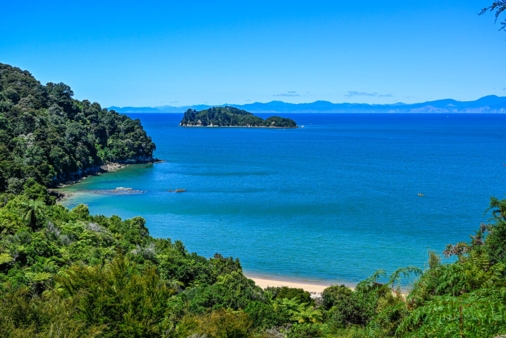 Als alle im richtigen Boot saßen, setzte sich die kleine Karawane aus Booten Richtung Wasser in Bewegung. Ein Traktor zog unser Boot ins Wasser, bis es tief genug war. Dann ging es erstmal zum Split-Apple-Rock, ein Fels, der wie ein gespaltener Apfel auf einem Steinpodest im Wasser lag. Dann sausten wir übers Wasser und hüpften über die Wellen, vorbei an grünen, urwaldbewachsenen Hügeln, leuchtend gelben Sandstränden und Kajakfahrern zur Anchorage Bay. Dort wurden auch von anderen Wassertaxi-Anbietern so einige Menschen an den Strand gekippt, aber die Menschenmassen hielten sich dennoch in Grenzen. Auch auf dem Küstenwanderweg, der sich überwiegend durch den Busch, wie man zum neuseeländischen Urwald sagt, schlängelte, verliefen sich die Menschenmassen gut und ich traf nur hin und wieder auf andere Wanderer. Verglichen mit der Ameisenstraße am norwegischen Preikestolen oder Kjeragbolten war es hier immer noch einsam. Immer wieder gab es Ausblicke durch das Urwalddickicht auf malerische Buchten mit grünblauem Wasser und goldgelbem Sandstrand.