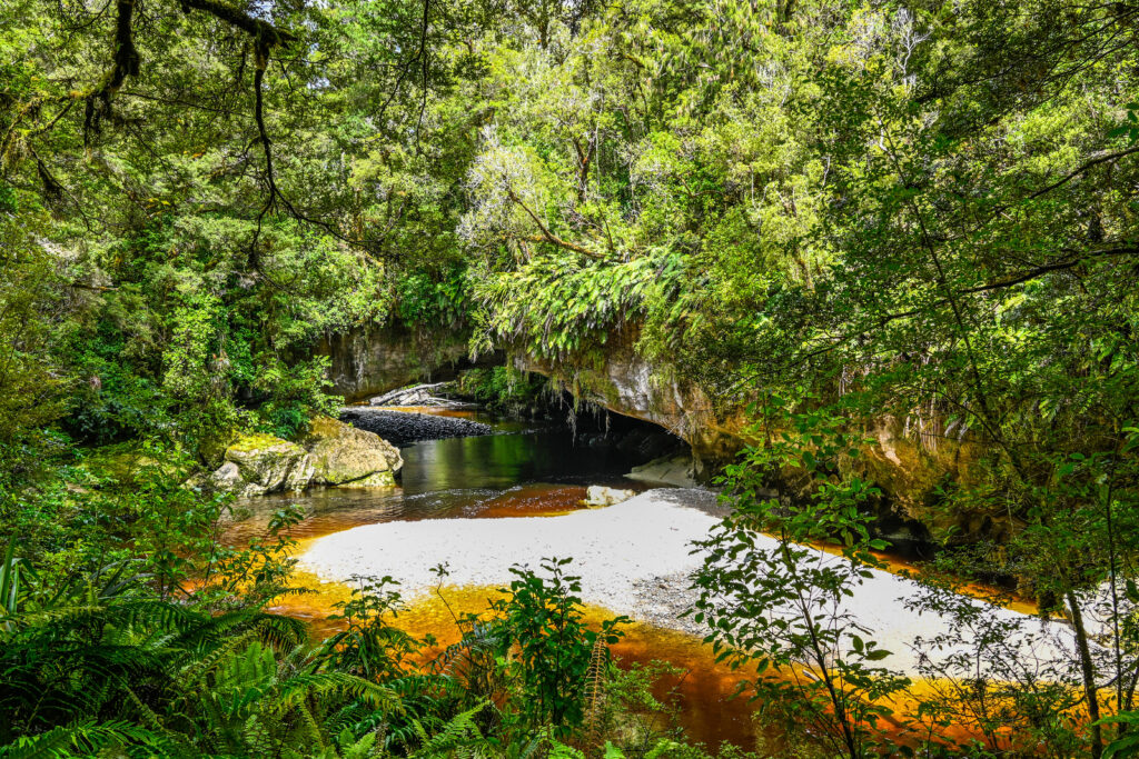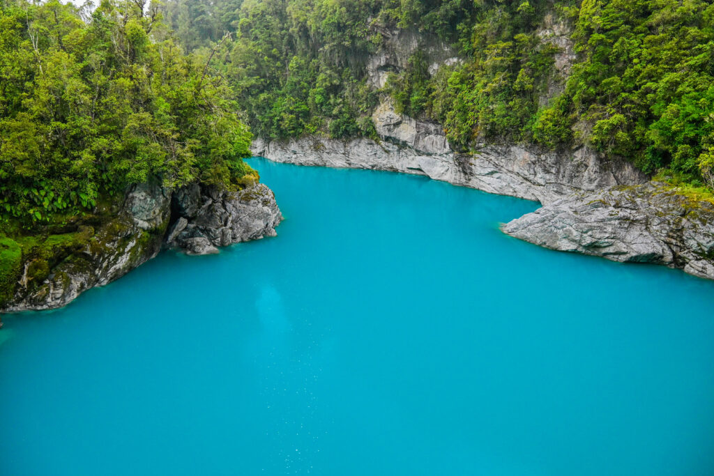 Spektakulär war hingegen die Hokitika Gorge, ein Fluss, der sich durch eine enge Schlucht aus hellgrauen Kalkfelsen und leuchtend grünen Farnen schlängelte. Das Wasser dieses Flusses war knalltürkis, man hätte meinen können, es hätte jemand Farbe reingekippt, denn von der Spiegelung des Himmels konnte die Farbe nicht kommen – es regnete. Es sind Gletschersedimente, die das Wasser so türkis-blau färben. Durch die Tiefe des Wassers und den langsamen Fluss kommt diese intensive Farbe zustande, die selbst bei Wolken leuchtet. Nur Starkregen über mehrere Tage kann die Farbe trüben und sogar in ein schlammiges Braun verwandeln, aber es regnete zum Glück nur leicht.