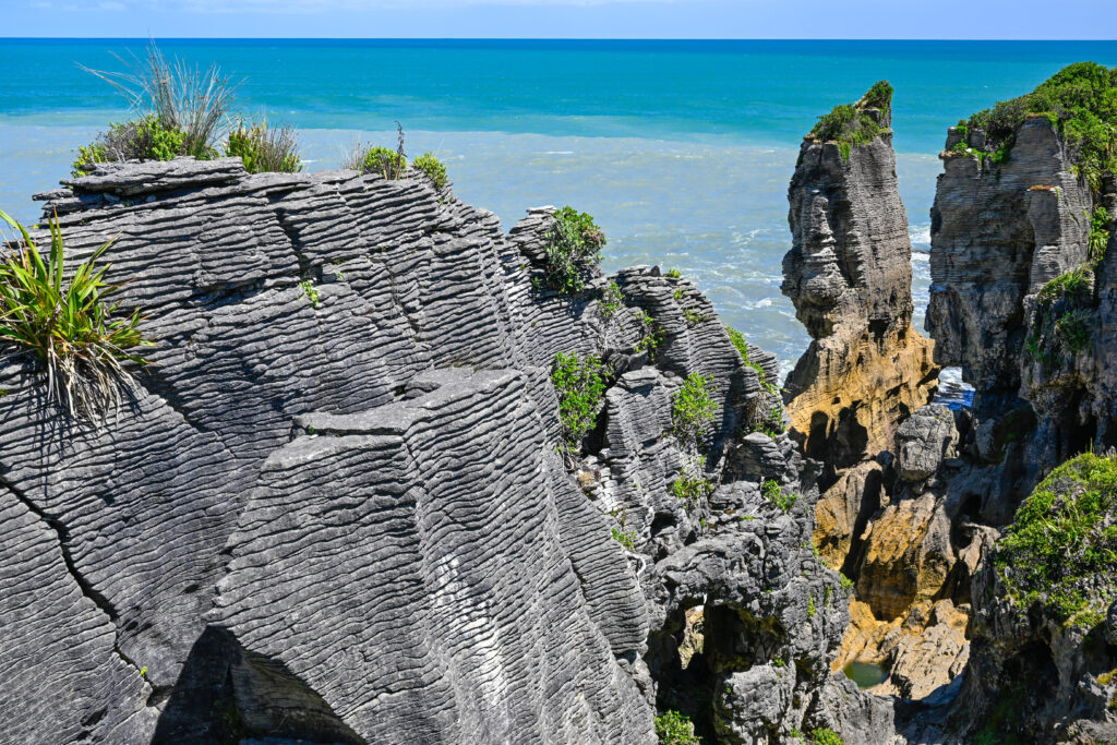 Am nächsten Tag ging es zu den Pankake Rocks: Bizarre Felsformationen an der Küste, die tatsächlich aussehen, wie aufeinander gestapelte Pfannkuchen. In manchen lassen sich sogar Gesichter oder Tiere erkennen. Sie entstanden vor vielen Millionen Jahren aus Muschelresten und Sand, die mit viel Druck aufeinandergepresst wurden und verhärteten. Erdbeben brachten die Felsen nach oben. Wind und Wasser schliffen die weicheren Teile raus und es entstand der Look, der an einen riesigen stapel Pfannkuchen erinnerte.