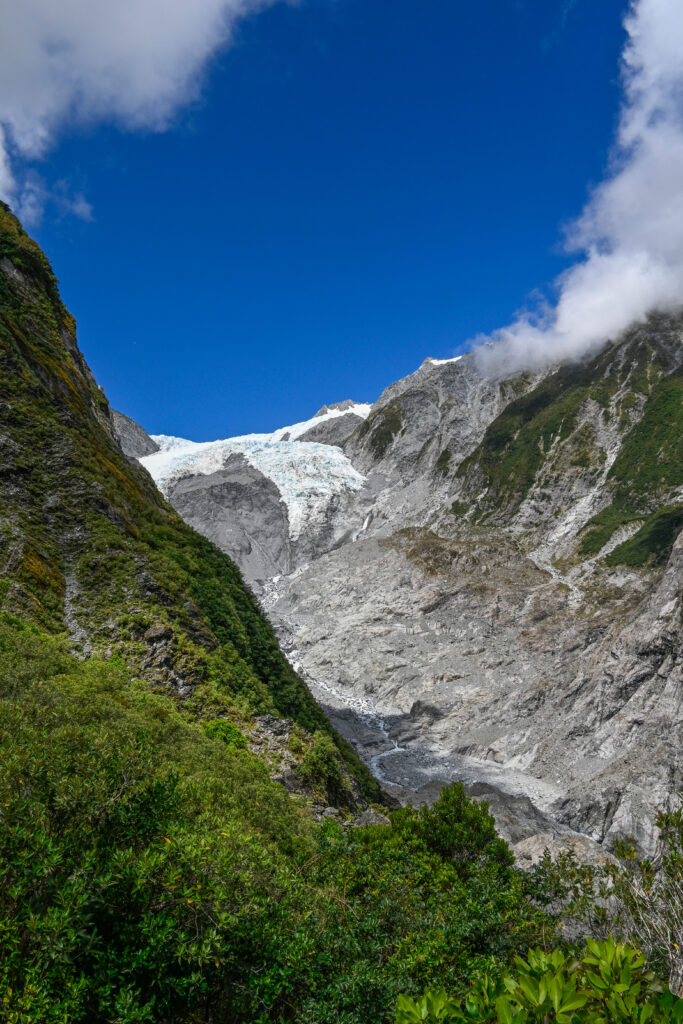 Am nächsten Morgen ging es in das Dorf Franz-Josef. Was auf einmal sehr deutsch klingt, ist eigentlich österreichisch, denn das Dorf und der angrenzende Gletscher sind nach dem österreichischen Kaiser benannt worden. Die einzige Existenzberechtigung dieses kleinen Ortes ist wohl der Tourismus, denn es besteht lediglich aus Hotels, Tankstelle, Supermarkt, Souveniershops und einer Reihe Büros, die alle das Gleiche anbieten: Helikopterflüge auf den Gletscher. Dies war allerdings nicht mein Ziel. Ich wollte mir den Blick auf die Eismassen erwandern. Der Weg startete recht harmlos entlang eines Flusses. Auf der anderen Seite einer recht breiten Hängebrücke begann dann allerdings die Kletterpartie über Stock und Stein. Teilweise musste ich 2,5m hohe Wände aus Wurzeln und Fels erklimmen. Größere Schluchten und Flüsse wurden mit Hängebrücken überbrückt, die so schmal waren, dass kaum zwei Füße nebeneinander Platz hatten. Sie waren zwar lang, trugen aber nur 1-5 Personen – mehr wäre bei dem Gewackel ohnehin nicht ratsam. Der Gletscherblick am Ende war jedoch alle Mühe wert, wenngleich sich der Gletscher in den letzten Jahren stark zurückgezogen hatte und nur recht weit entfernt am Ende des Tals zu sehen war. Vor 100 Jahren konnte man hier auf den Gletscher gehen.