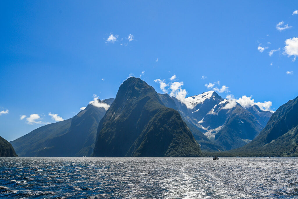 Am nächsten Morgen schien die Sonne. Ein paar Wolken hingen noch verschlafen an den Berggipfeln fest und das Wasser vom nächtlichen Regen verdampfte auf der Straße. Zusammen mit zwei Trampern aus den USA, die ich in Te Anau aufgesammelt hatte, ging es zum Milford Sound. Das Tal wurde immer enger, die Berge immer höher und ich fühlte mich sehr an Norwegen erinnert. Die Bootstour über den Fjord ging dicht an den Bergen entlang, vorbei an Seelöwen, die sich auf den Felsen sonnten, rauschenden Wasserfällen und überhängenden Felsen. Die Wolken hatten sich mittlerweile komplett verzogen und die Sonne schien vom wolkenlosen Himmel.