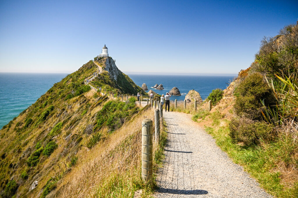 Die Cathedral Caves waren riesige Höhlen, die das Wasser über viele tausend Jahre in die Klippen gewaschen hatte. Langsam kam auch die Sonne wieder raus – ich war zwar immer noch im Süden der Südinsel aber schon ein bisschen östlicher. Der Leuchtturm am Nuget Point war eigentlich nur die Spitze eines Leuchtturms auf einer Klippe hoch über dem Wasser. Die Küste hier war schön: hohe Klippen, dazwischen einsame Buchten mit goldenen Sandstränden, an denen man stundenlang Muscheln sammeln konnte. Hier gab es so viele der blau-schillernden Paua-Muscheln, dass die Einwohner hier sogar ihre Hausnummern aus ihnen bastelten.