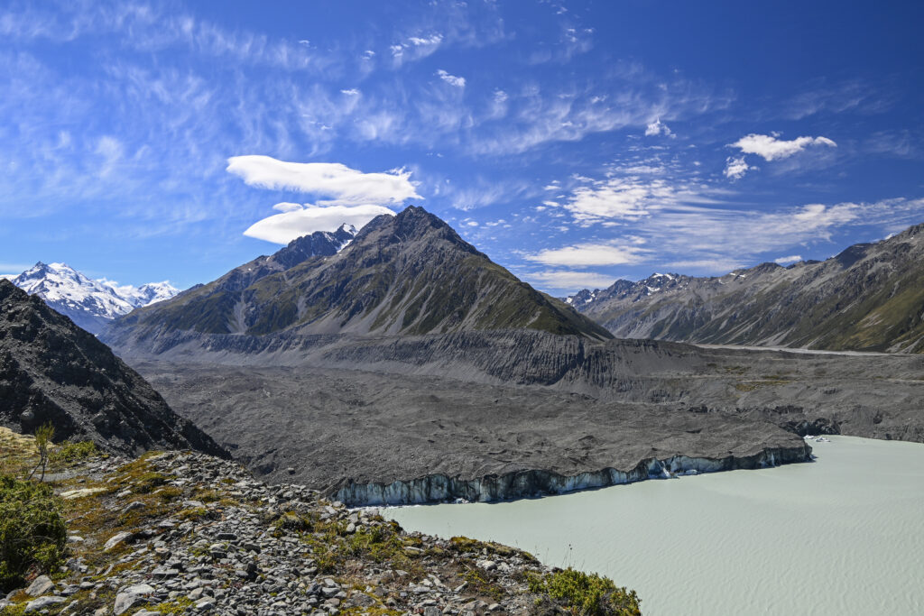 Oamaru – eine Kleinstadt an der Küste war eine kleine Überraschung. Hier gab es viel schöne alte Architektur und sogar so etwas wie eine Altstadt mit vielen kleinen Läden in denen es viel Selbstgemachtes und Kunst zu kaufen gab. Auf Empfehlung eines Künstlers, der lustige Gesichter aus Schrott baute, gönnten wir uns nebenan ein kleines belgisches Craftbeertasting und sahen dem Treiben auf der Straße zu.Am Abend ging es wieder ins Landesinnere Mount Cook, dem höchsten Berg Neuseelands, entgegen.Die Landschaft wurde zunehmend bergiger, doch schließlich gelangten wir auf eine Hochebene: endlose Prärie und am Horizont schimmerten die Berge in Blau. Schließlich tauchte Lake Pukaki auf. Der See schimmerte in knalligem Türkisblau zwischen den kargen, teilweise schneebedeckten Bergen. An seinem Ende thronte stolz Mount Cook mit seinen fast 4000m Höhe. Wir entschieden uns zu erst für die Wanderung zum Abel Tasman Gletscher in einem Nebental. Der Weg zum Glacier-Viewpoint war von Asiaten überrannt. Den Wanderweg entlang des Gletschersees hatten wir hingegen fast für uns alleine. Allerdings sahen wir von dem See erstmal nichts, denn ein riesiger Wall aus Schutt versperrte die Sicht. Wir wanderten zwischen dem Wall und steilen Bergen und träumten von Mittagspause in der Sonne mit den Füßen im Gletschersee. Am Ende des Sees hatten wir auch das Ende des Walls erreicht und staunten nicht schlecht, als wir den See gefühlt 150m unter uns in milchigem Türkis schimmern sahen. Der Gletscher war von einer dicken Schicht aus Schutt und Geröll bedeckt, das ihn daran hinderte, so schnell zu schmelzen, wie die anderen Gletscher in der Umgebung. Doch am See schimmerte das Eis blauweißlich und man konnte es knacken hören.