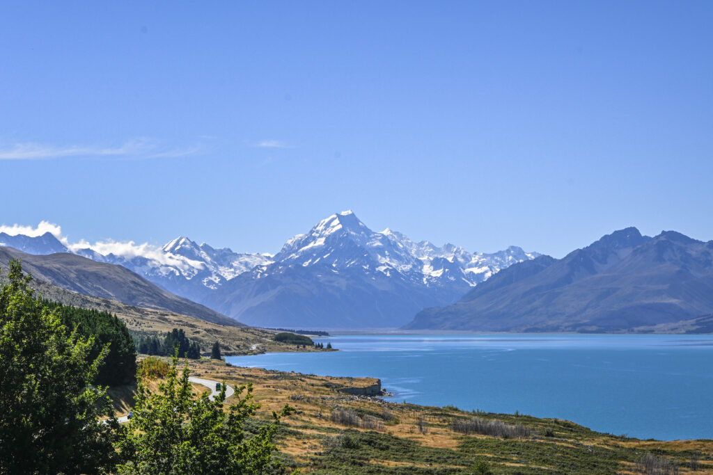 Die Straße führte an den großen Seen entlang durch eine komplett andere Landschaft aus grasbewachsenen Bergen mit schneebedeckten Spitzen.