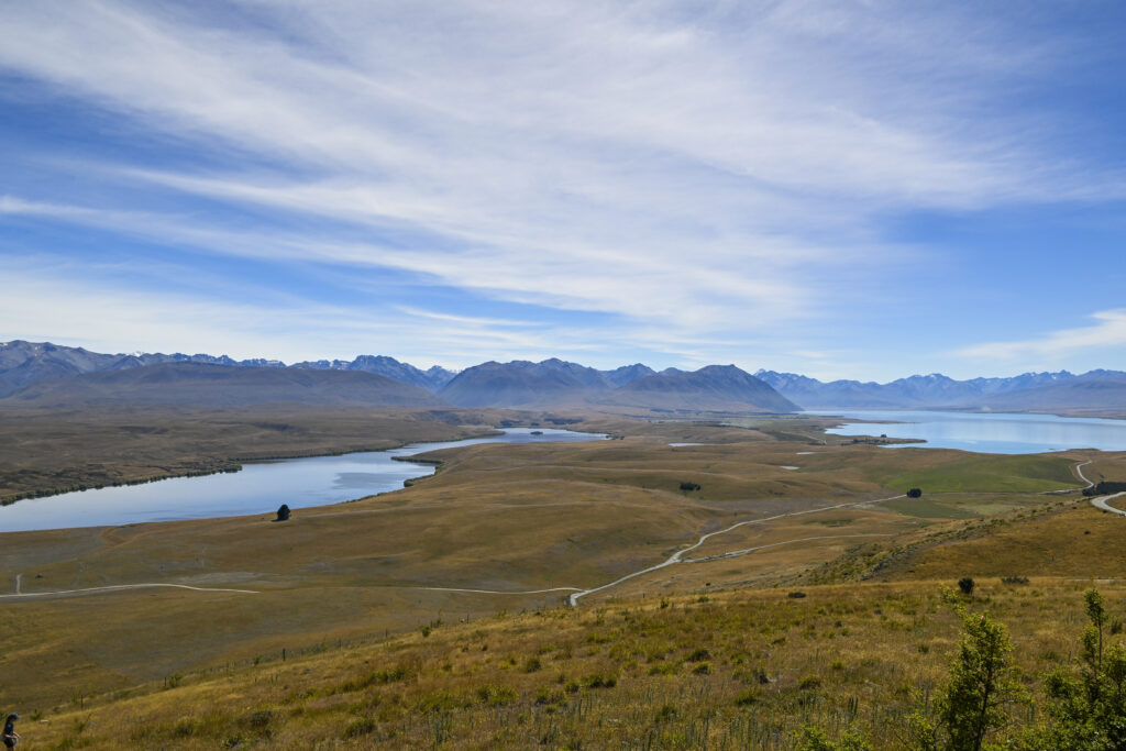 Nach zwei Tagen verließen wir das Mount Cook Valley mit seinem blauen Lake Pukaki und fuhren ein Tal weiter zum nächsten großen türkisblauen See: Lake Tekapo. Der ist vor allem wegen seiner bunten Lupinenblütenprachten am Ufer bekannt, doch für die waren wir leider zu spät. Von den Blüten waren nur noch vertrocknete Samenschoten übrig. Der Blick vom Mount John auf den blauen See und die umliegende Hochebene, die von teilweise schneebedeckten Bergen umrahmt war, war die Anstrengung der kleinen Bergtour auf jeden Fall wert. In dem Café am Gipfel, das mit dem Auto erreichbar war, waren wir wohl die einzigen europäischen Gäste unter lauter Asiaten, die in ihren Spitzenkleidern aus einer anderen Welt hier hergefallen schienen. Insbesondere die Frauen hatten ihre Gesichter oft komplett verhüllt: die untere Gesichtshälfte war mit einer Maske bedeckt, die Augen mit der Sonnenbrille und der Kopf mit einem Sonnenhut mit riesiger Krempe. Manche hielten noch einen Sonnenschirm über sich, obwohl die Sonne bei dem verdeckten Kopf und der langärmligen Bekleidung keine Chance hatte, auch nur ein kleines Bisschen Haut zu bescheinen. Nur für ein Foto wurde die Schutzbekleidung abgenommen, dann schnell wieder aufgesetzt, denn man wollte auf keinen Fall braun werden und aussehen, wie ein Arbeiter auf dem Reisfeld.