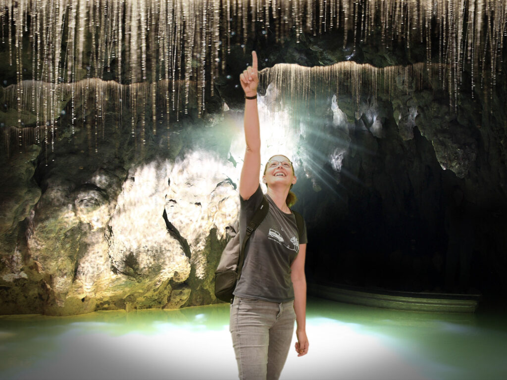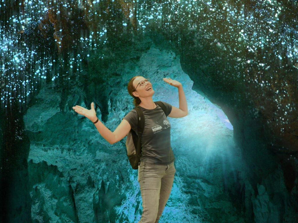 Weiter geht´s zu den Waitomo Caves, die für ihre Glühwürmchen bekannt sind, die tatsächlich wie Sterne bläulich an der Höhlendecke funkeln. Mit einem Boot gleiten wir lautlos auf dem Fluss, der durch die Höhle fließt dahin. Sprechen dürfen wir nicht, um die leuchtenden Insekten nicht zu stören. Diese Glühwürmchen sind jedoch keine Glühwürmchen, wie wir sie in Europa kennen. Es ist die Larve einer Motte, die gerne an Felsüberhängen hängt und klebrige Fäden nach unten hängen lässt. Mit ihrem blau-weißen Licht möchte sie Insekten anziehen, in der Hoffnung, dass diese sich in den klebrigen Fäden verfangen. Wenn es irgendwo wackelt, zieht die Larve den entsprechenden Faden nach oben zu sich und verspeist, was daran hängen geblieben ist.
