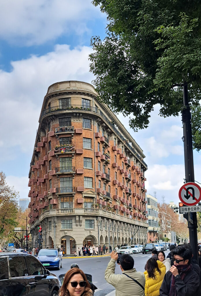 In der Innenstadt hielten wir als erstes beim Wukang Mansion, einem Gebäude, dessen Architektur so gar nicht chinesisch, sondern eher europäisch wirkte. Rötliche Backsteinfassade auf einer grauen Mauer mit runden Torbögen. Das Haus war zwischen zwei spitz aufeinander zulaufenden Straßen erbaut und erinnerte durch seine dreieckige Form eher an das Hamburger Chilehaus mit abgerundeter Ecke. Es stammte aus der Zeit der französischen Konzession, in der man im damals internationalen Shanghai gerne Häuser im europäischen Architekturstil baute. Wir sahen auch noch weitere Häuser, die überraschend europäisch wirkten.