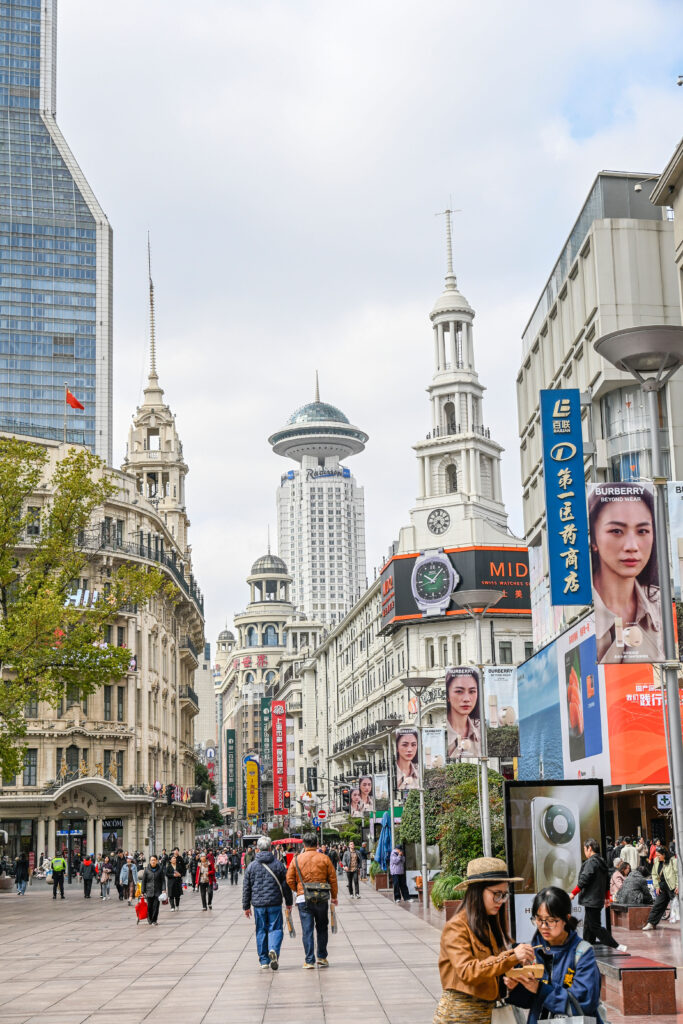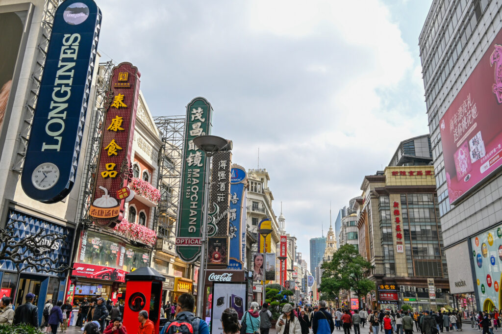 Am People´s Square erblickte ich zwischen den Wolkenkratzern das Tageslicht. Hier begann auch de Nanjing Road, die wohl bekannteste Einkaufsstraße Shanghais und gleichzeitig meistbesuchte Fußgängerzone der Welt. In ihren Bann gezogen, ließ ich die Hop-on-Hop-off-Busse links liegen und folgte ihr erstmal ein Stück. Wo sich in Deutschland Geschäfte für Mode, Spielzeug oder Elektroartikel aneinander reihten, drängten sich in Shanghai statt einzelner themenbezogener Geschäfte ganze themenbezogene Einkaufszentren dicht an dicht. Als Europäerin, die staunend alle paar Meter für ein Foto stehen blieb und noch dazu eine große Kamera um den Hals trug, stand mir der Touristenstatus förmlich auf die Stirn geschrieben und ich wurde umzingelt von Leuten, die mir Bilder von teuren Designerhandtaschen zeigten und mich in eines der Gebäude ziehen wollten. Obwohl ich nicht genau wusste, was diese Leute von mir wollten, ahnte ich nichts Gutes und ließ sie stehen. Wenn ich ein Foto machen wollte, versuchte ich immer in Sichtweite eines Polizisten stehen zu bleiben, so konnte ich mir etwas Ruhe verschaffen. Erst später fand ich heraus, dass man versuchte, mich zum Kauf gefälschter Markenartikel in irgendwelchen dubiosen Hinterstübchen überreden wollte.