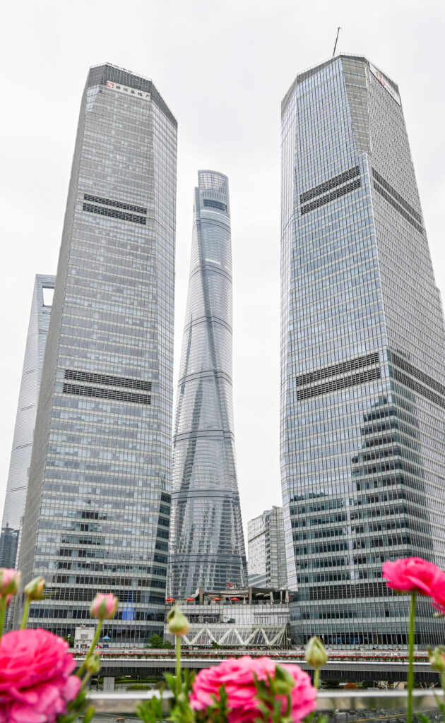 Mit vollem Magen ging es wieder zum Bus und weiter in das Finanzviertel von Shanghai. Ich wollte die Wolkenkratzer mal aus nächster Nähe betrachten. Als ich auf der ringförmigen Fußgängerbrücke stand und auf den Kreisverkehr hinunterblickte, den sie umschloss, fiel mir die Detailverliebtheit der Stadt auf. Die Insel des Kreisverkehrs war nicht nur mit aufwändig zu Blüten und Delfinen zurechtgestutzten Büschen und zahlreichen ornamentartig angepflanzten Blumen geschmückt, auch an der Brücke (und allen anderen Bücken und Straßen in der Stadt) hingen Blumenkästen dicht an dicht nebeneinander, die mit tausenden Blumen bepflanzt waren. Die Stadtgärtnerei musste hier sehr viel Personal haben um all die Kästen zu bepflanzen, die Skulpturen zu beschneiden und Beete zu pflegen.